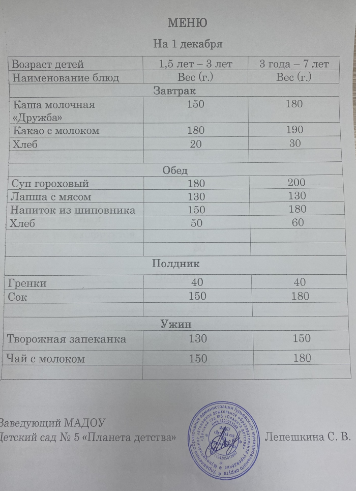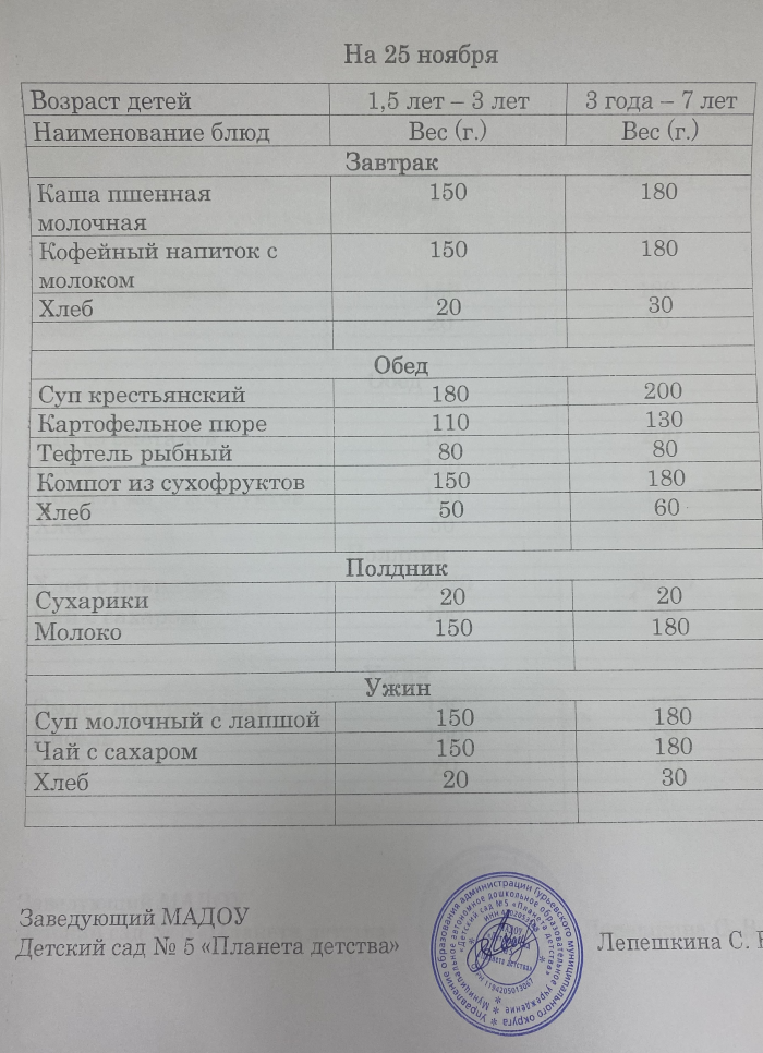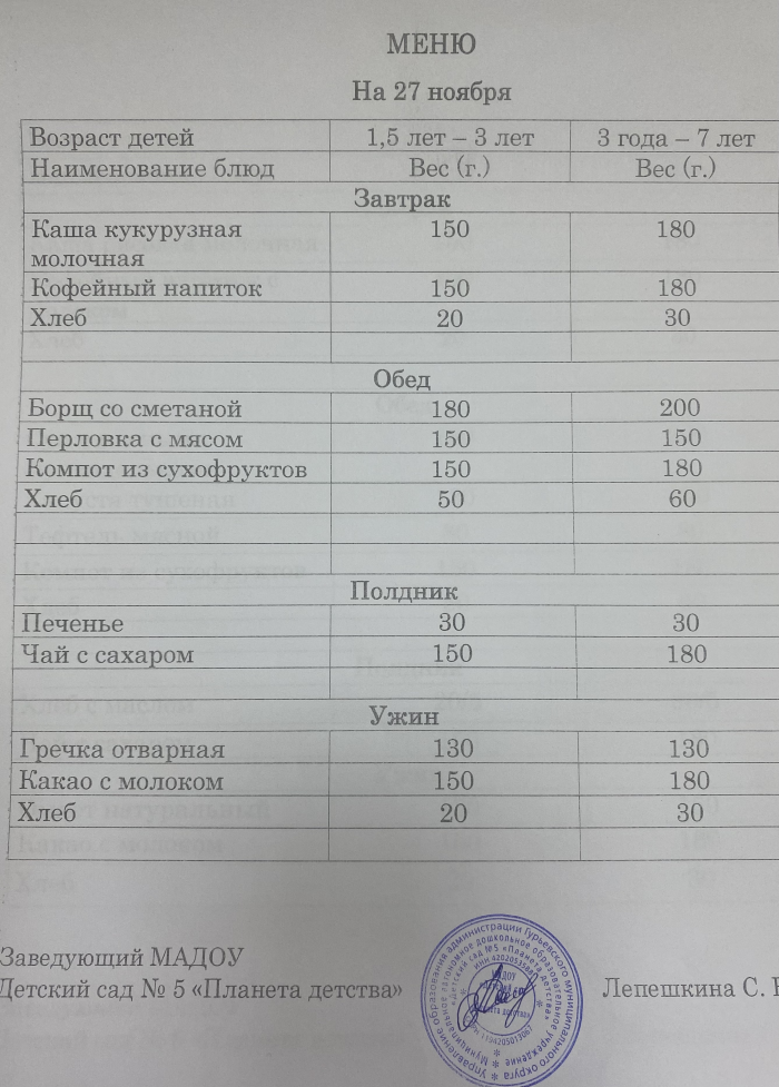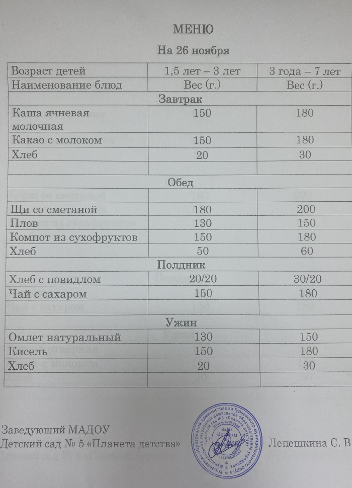 На основании Постановления Главного государственного санитарного врача России от 22.08.2024 № 9 О внесении изменений в санитарно-эпидемиологические правила и нормы СанПиН 2.3/2.4.3590-20 "Санитарно-эпидемиологические требования к организации общественного питания населения", утвержденные постановлением Главного государственного санитарного врача Российской Федерации от 27.10.2020 № 32 "8.1.7. Детские организации, осуществляющие общественное питание детей в организованных детских коллективах, должны размещать в доступных для родителей и детей местах (в том числе в обеденном зале, холле, групповой ячейке, на официальном сайте образовательной организации в информационно-телекоммуникационной сети "Интернет") следующую информацию: ежедневное меню основного (организованного) питания на сутки для всех возрастных групп детей.Настоящее постановление вступает в силу с 01.03.2025 года.