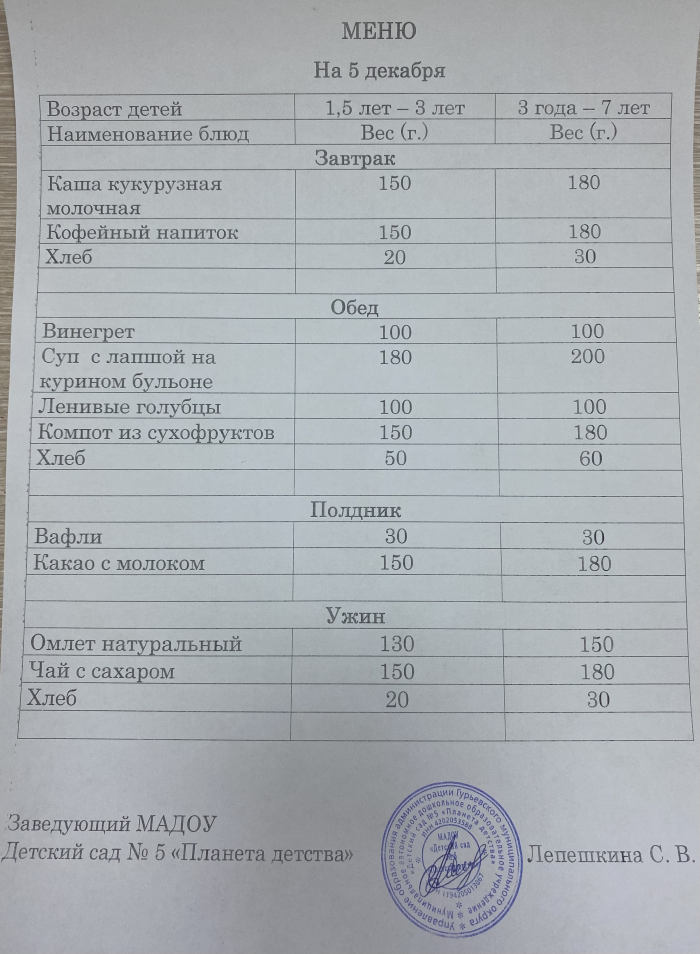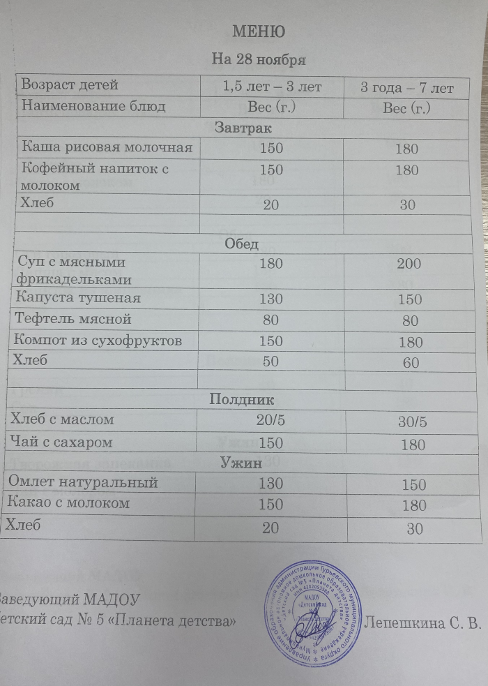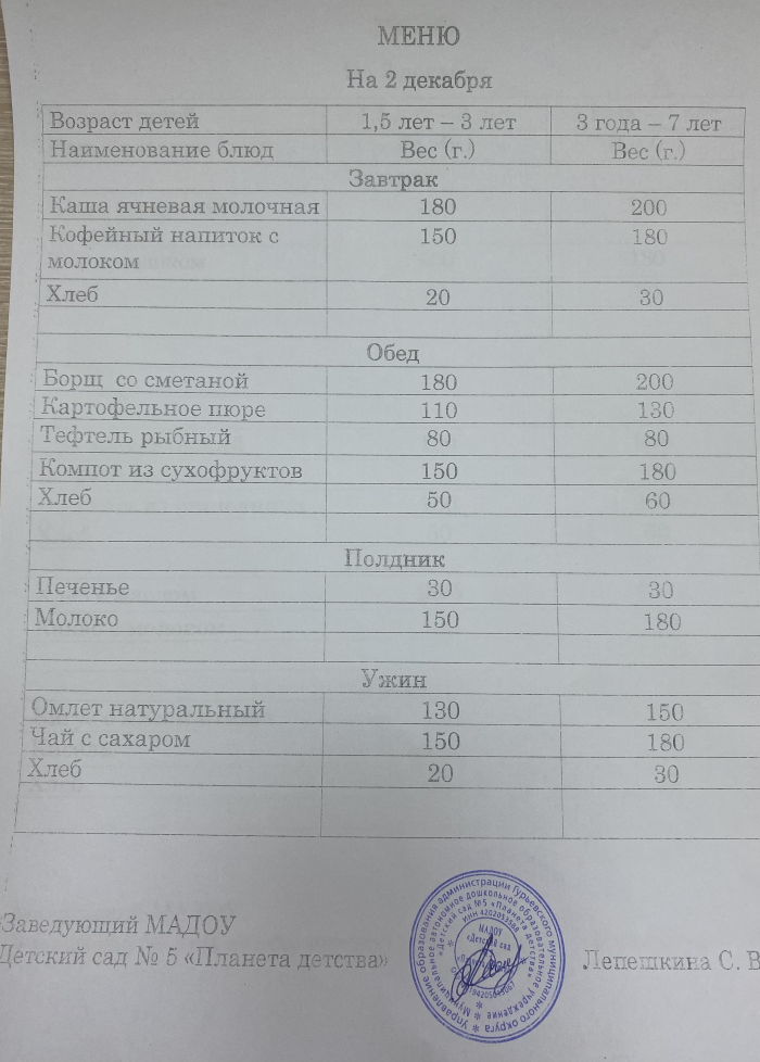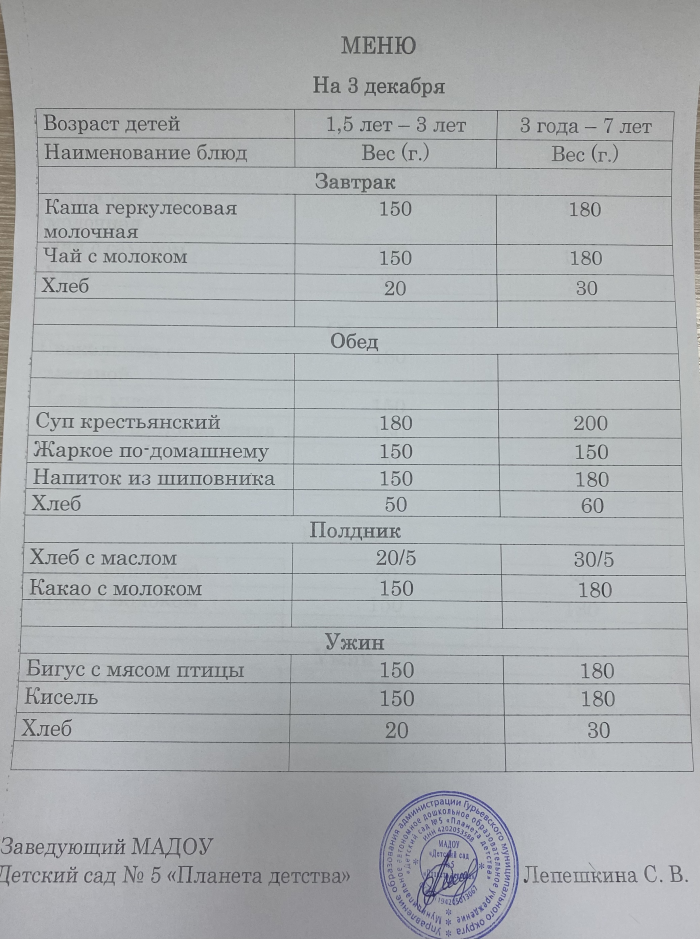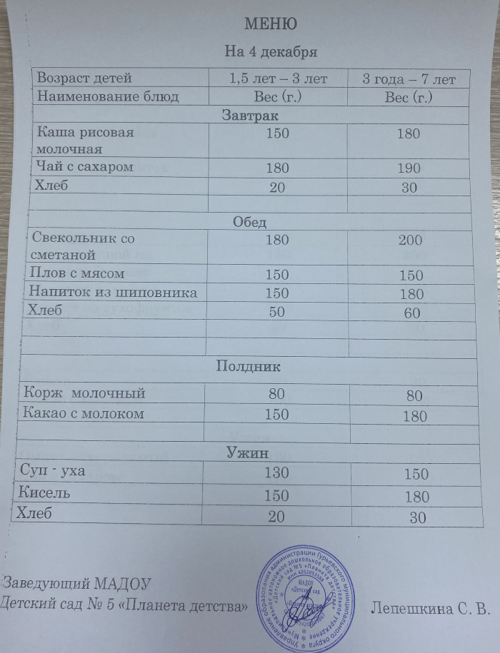 | Информация о наличии диетического меню в ДОУ | Нет диетического меню в ДОУ |